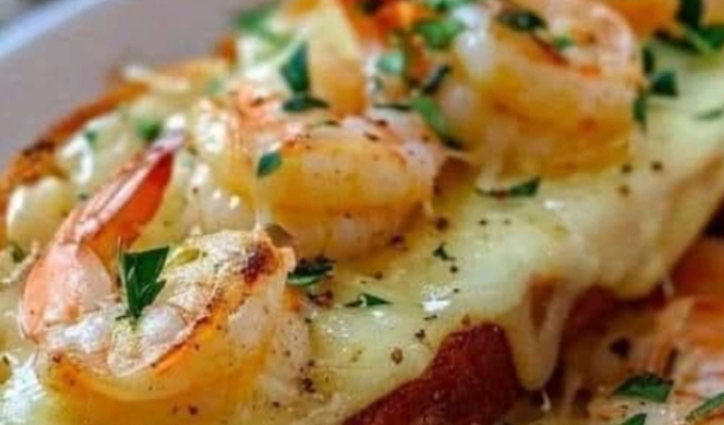 On one half of the garlic bread, layer the cooked shrimp and sprinkle with Monterey Jack cheese.