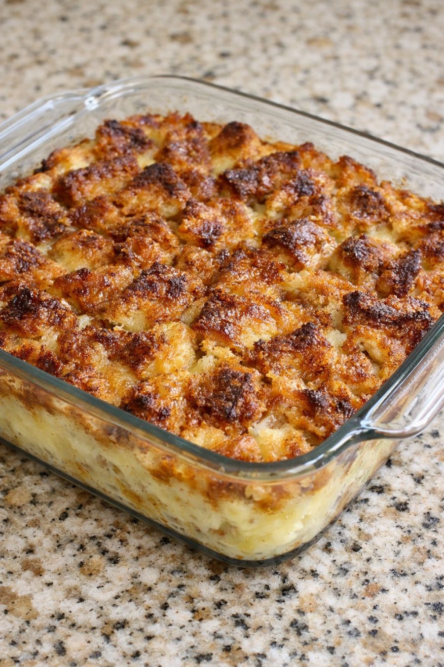 Bake for 40–50 minutes, until the top is browned and slightly crisp, the edges look set and custardy, and a knife inserted near the center comes out mostly clean with just a bit of soft custard clinging. The center should be just set but still a little jiggly, like a soft baked custard.
